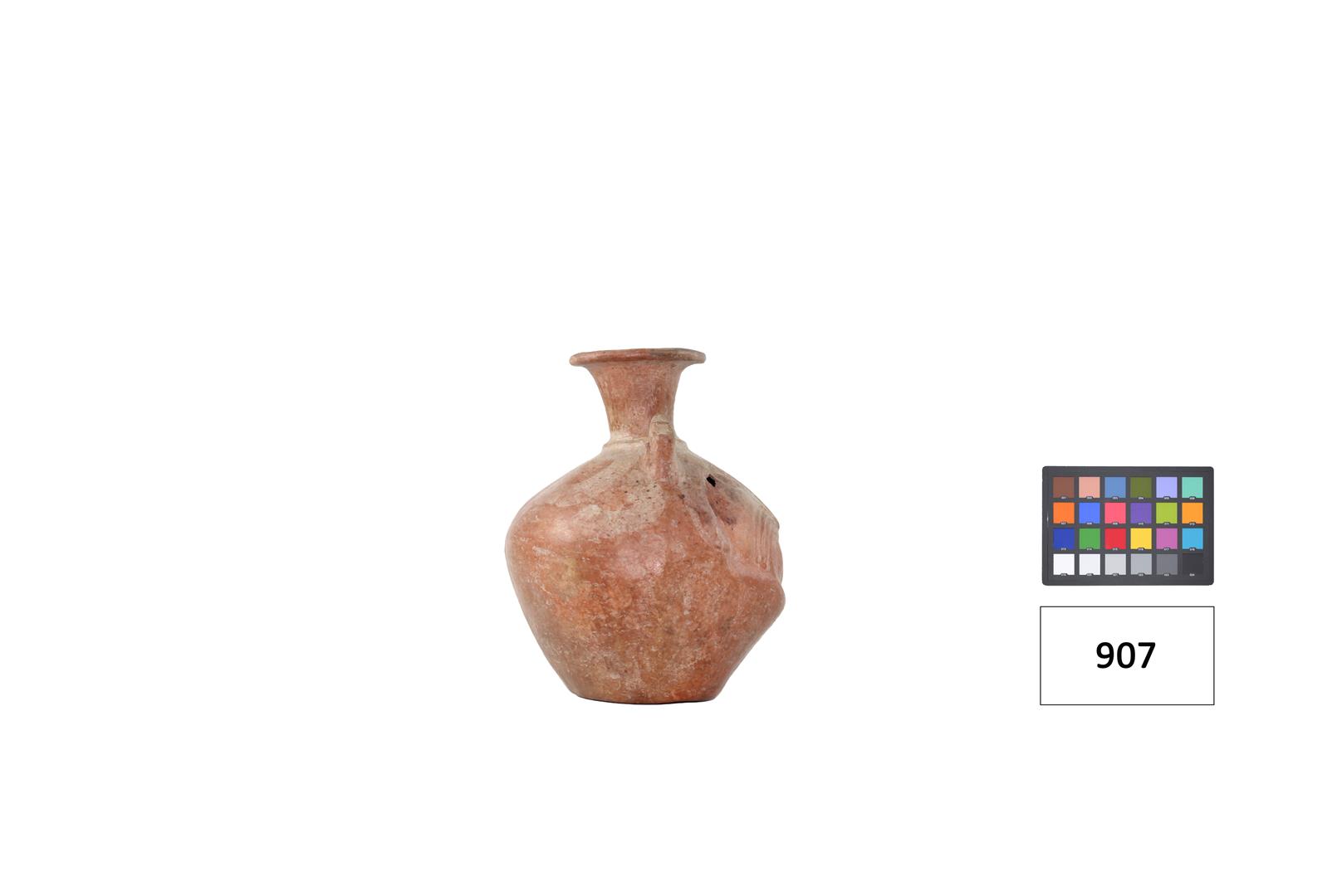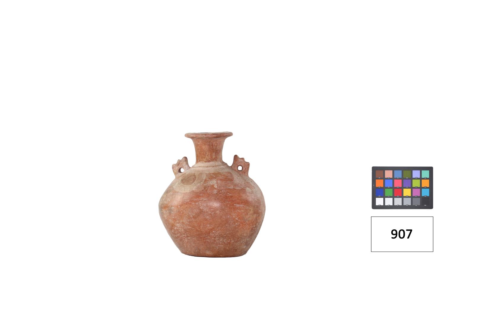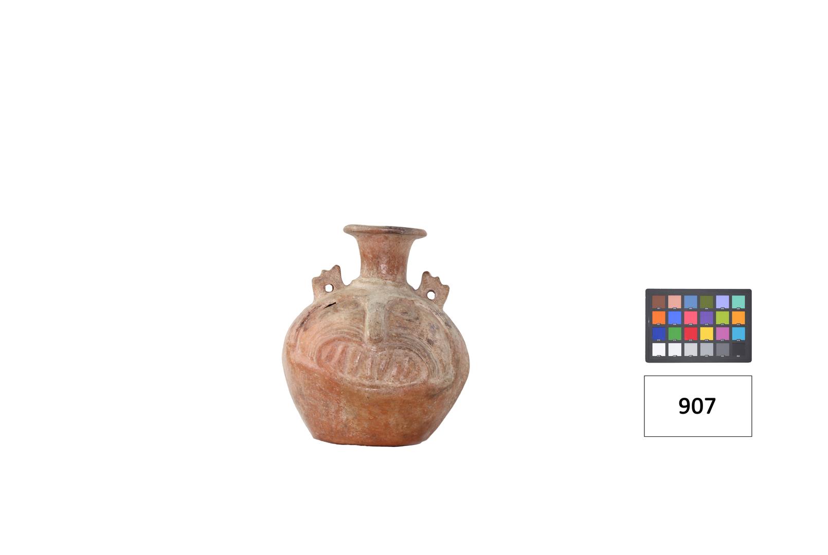 Objeto de formato circular com bojo esférico e gargalo com aba no extremo na cor terracota, em argila. Ladeando o gargalo, duas peças retangulares com furos e parte superior serrilhada. No bojo entalhe de rosto com dentes aparentes, bigode, nariz alongado e olhos redondos.