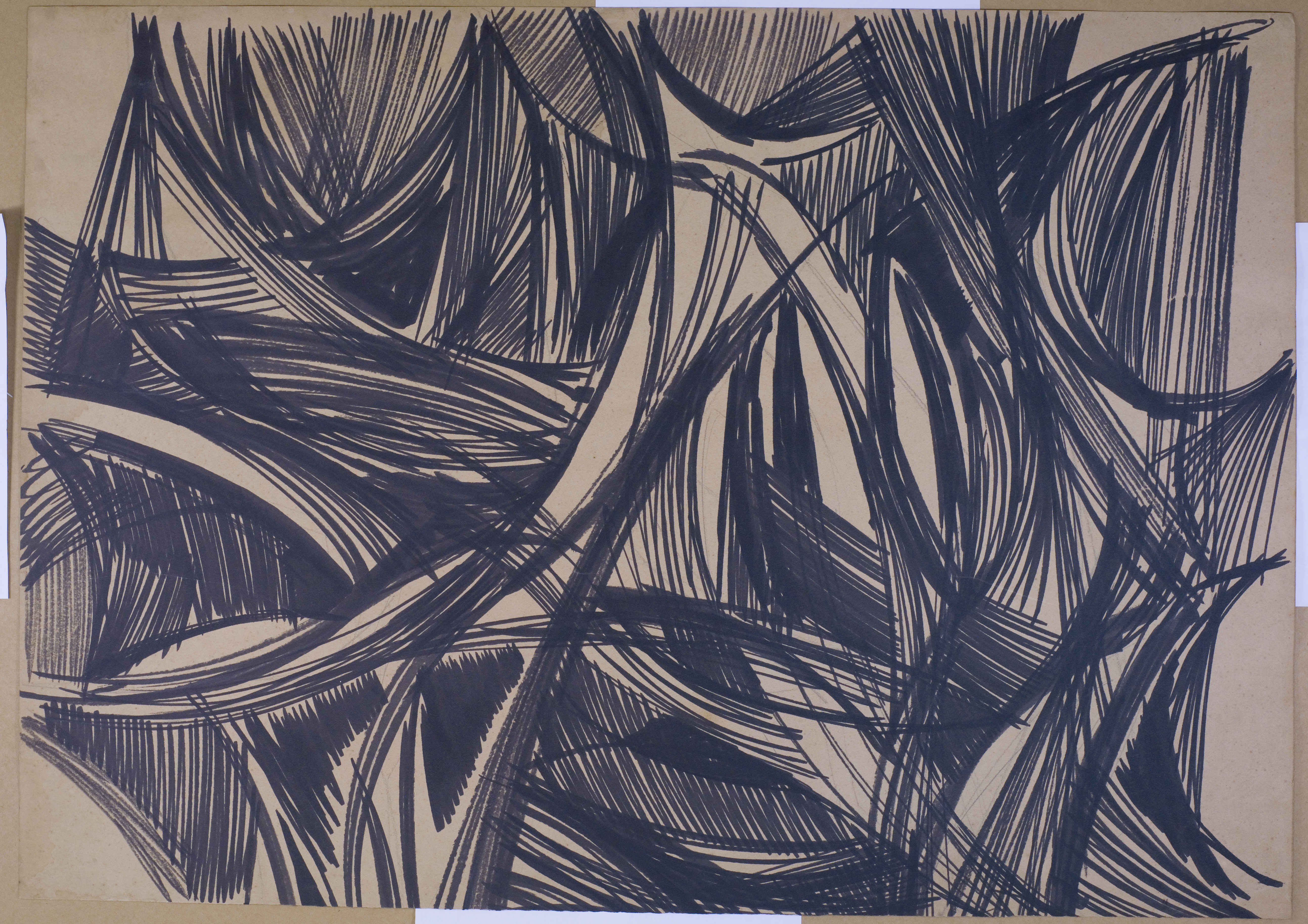 Desenho abstrato em tom de preto. Composição com feixes de linhas curvas entrecruzadas e com os espaços criados preenchidos aleatoriamente por rabiscos.