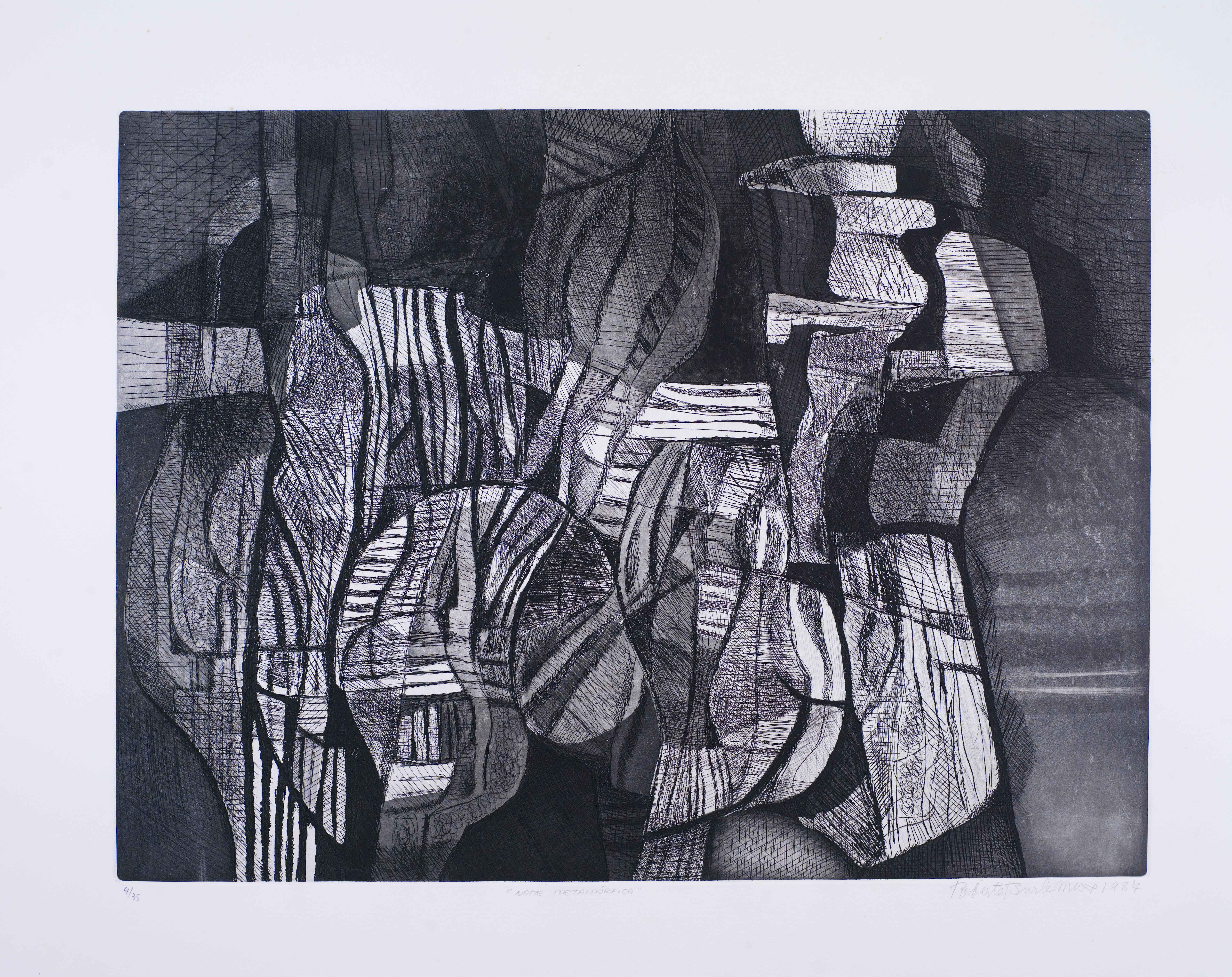 Composição abstrata em preto. Linhas retas e curvas com traço grosso intercaladas por riscos com traço fino; fundo em tons de cinza e preto com áreas sem cobertura de camada pictórica ao centro. Obra assinada e datada.
