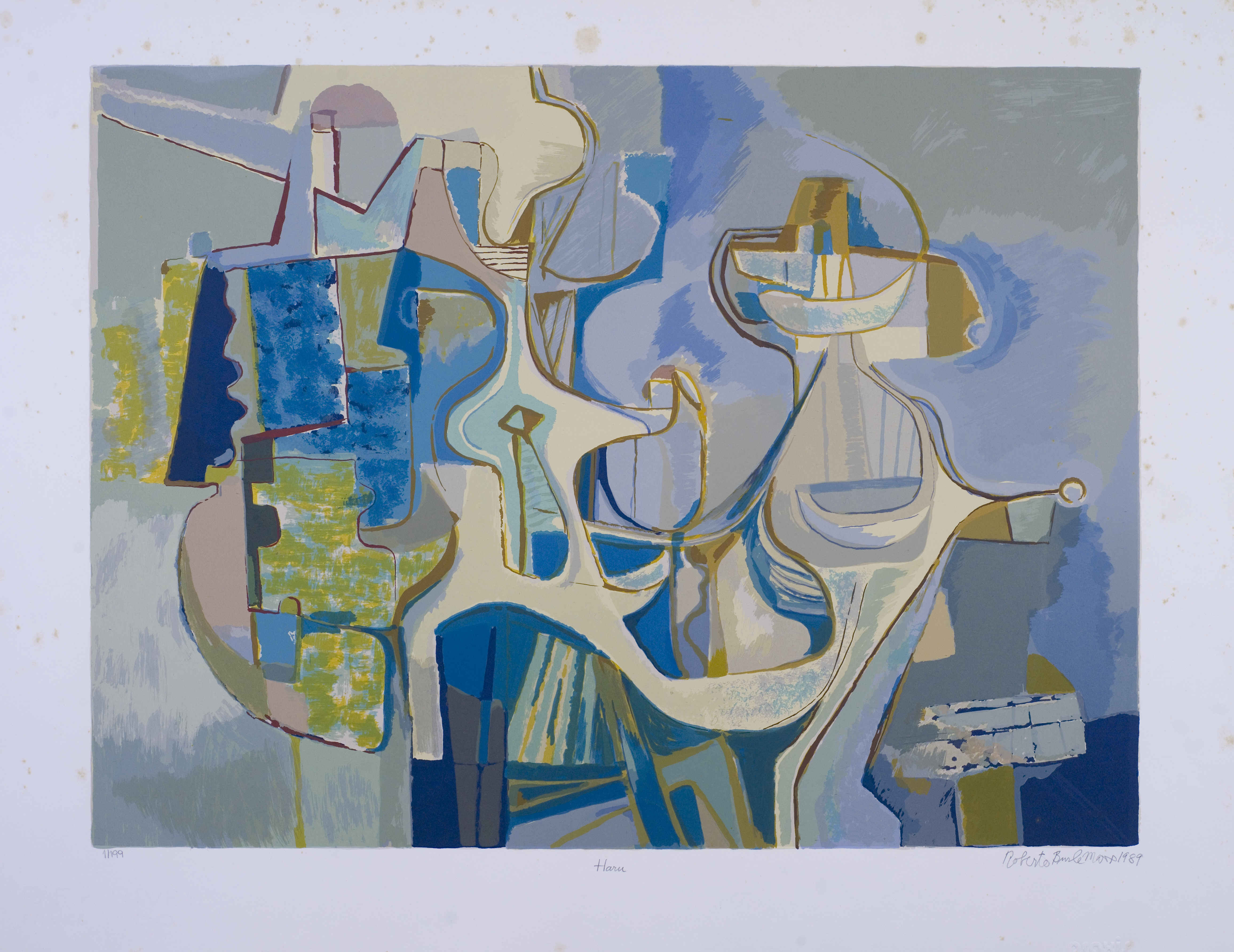 Composição abstrata em tons pasteis de verde, azul, cinza, creme, rosa e amarelo. Linhas à direita elaboram desenhos parecidos com formas de barcos. À esquerda, linhas em tons de magenta são preenchidas com diferentes tons e aspectos de pincelada. Assinada e datada.