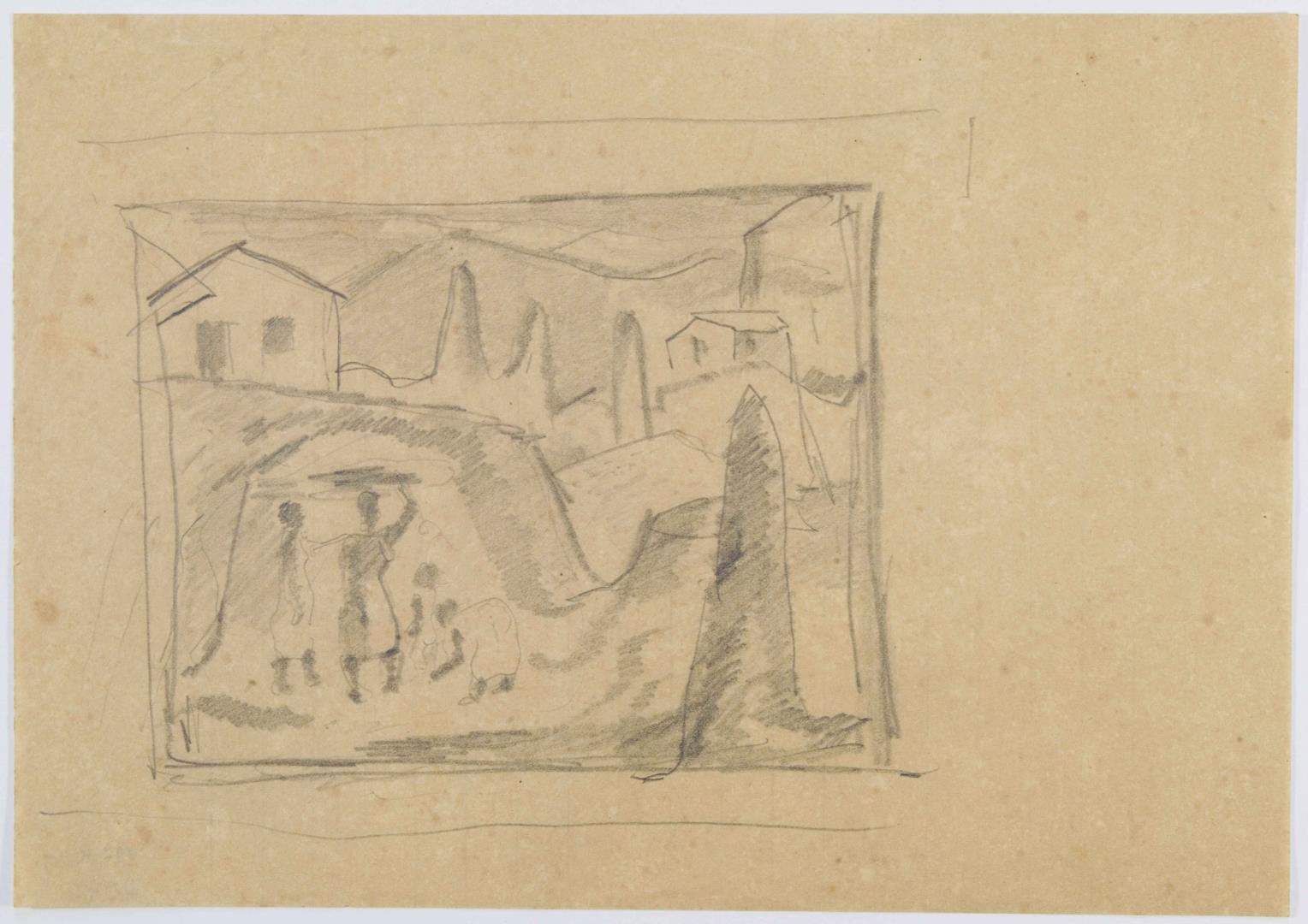 Paisagem com montículos, figuras humanas e casas à grafite. Grupo de figuras humanas no CIE, montículo cônico no CIE e outros três ao fundo entre duas casas sobre morro. Enquadrado em área retangular delimitada pelo artista.