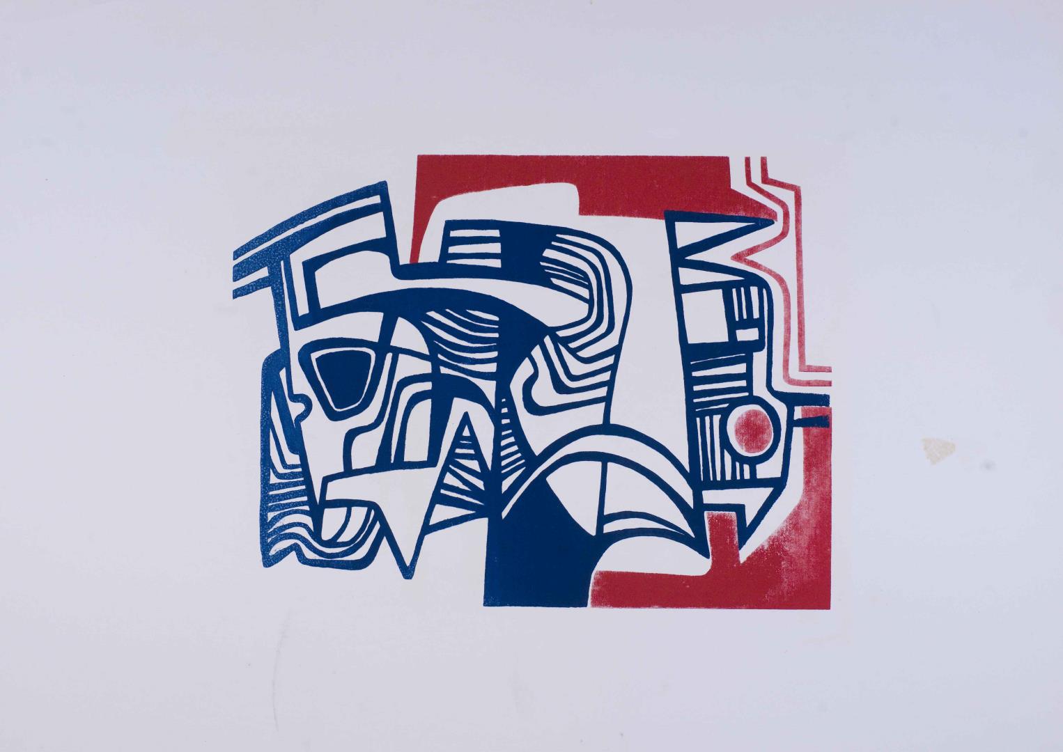 Composição abstrata com primeira matriz de cor vermelha na lateral esquerda. Encaixada na mesma, segunda matriz com linhas em tons de azul. Detalhe circular no canto superior esquerdo em azul e vermelho.