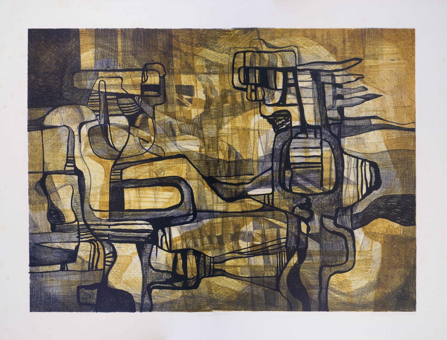 Composição abstrata em tons ocre e preto. Nos lados esquerdo e direito, formas abstratas demarcadas por linhas grossas e parcialmente preenchidas por rabiscos em preto e conectadas por linhas na parte inferior, sobre área em tons de ocre preenchidos por linhas, quadriculado e rabiscos. Obra assinada e datada.
