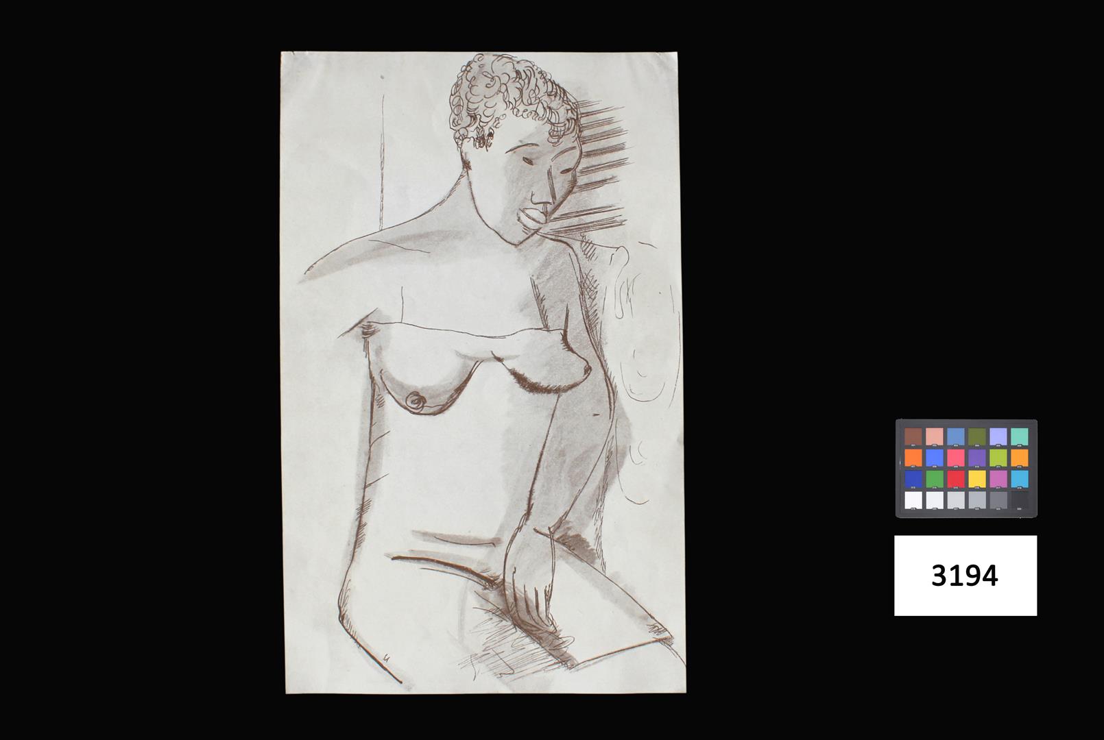 Composição de formato retangular na cor marrom. Em campo ao centro, figura feminina sentada, cabelos curtos encaracolados, lábios grossos, trajando indumentária transparente na altura dos seios e na coxa. Braço esquerdo flexionado com mão entre coxas.