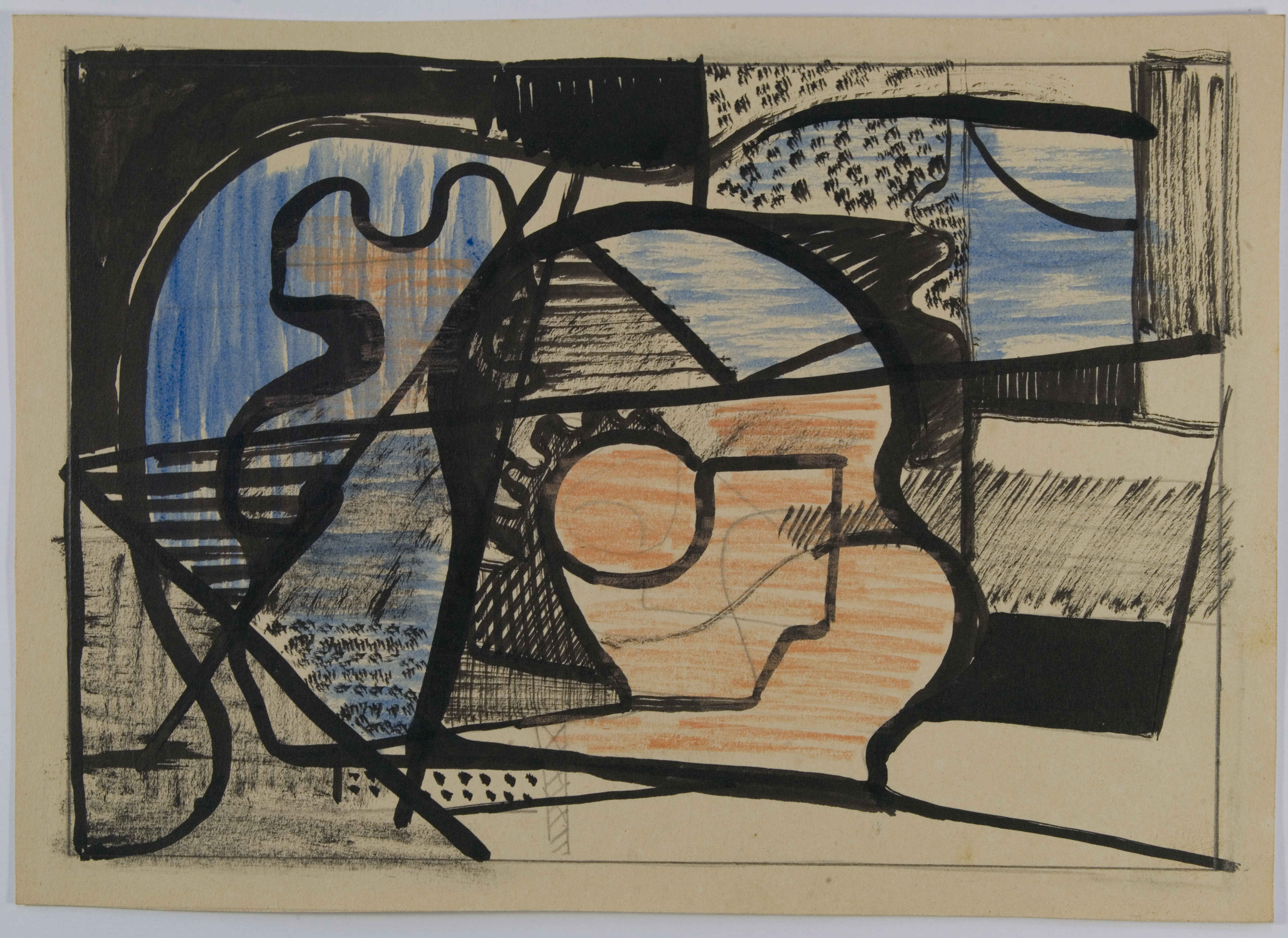 Desenho abstrato com linha de contorno em tom de preto e preenchimento em tom de preto, azul e laranja. Enquadrado em área retangular delimitada pelo artista. Adensamento da cor preta no CSE. Área azul na metade superior e área em laranja ao centro.