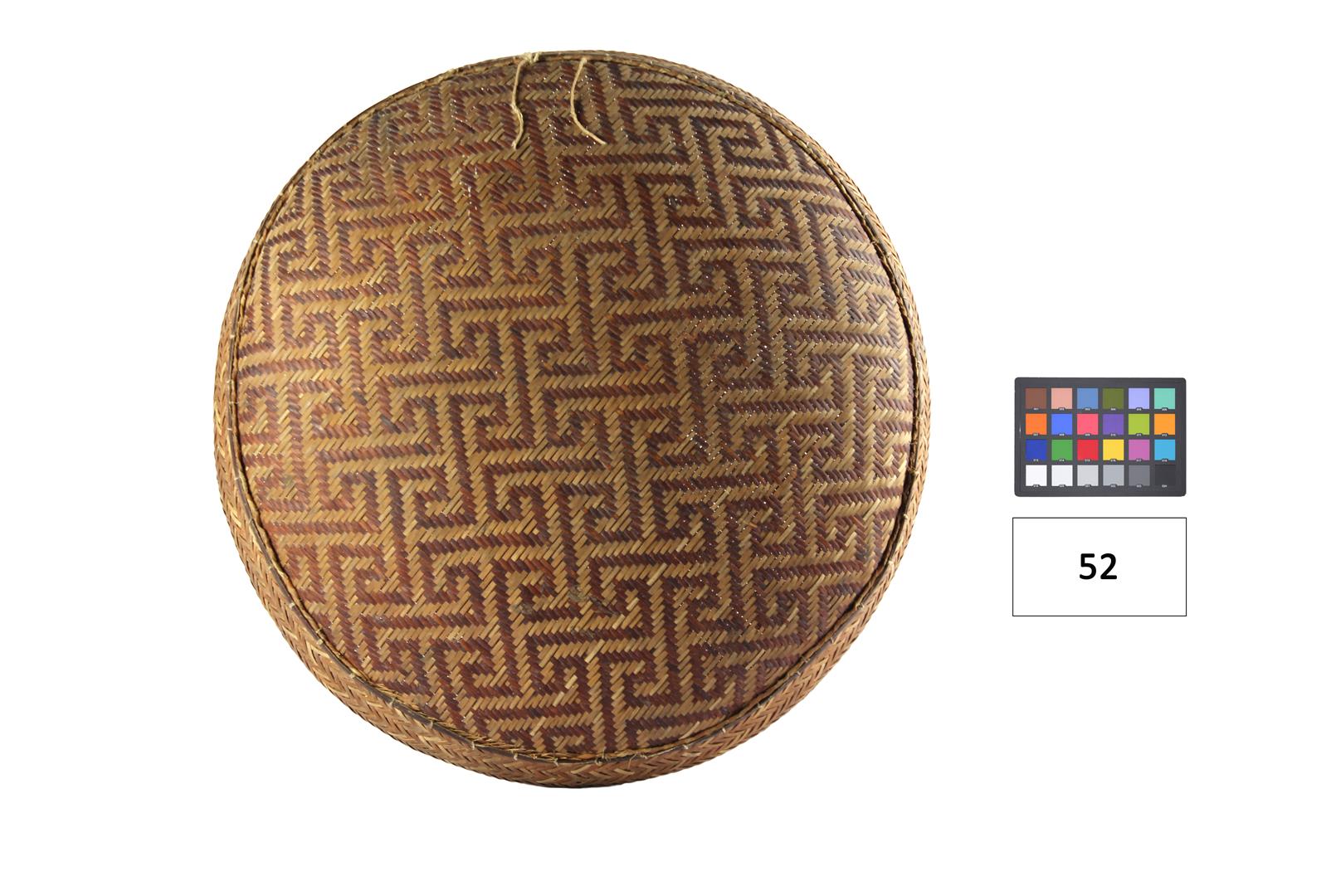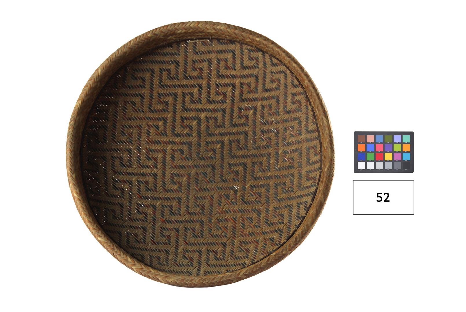 Objeto de formato circular, côncavo, em fibra vegetal nas cores bege, ocre e preto. Borda com faixa fixada por haste de madeira presa dos dois lados, por fio de fibra vegetal. Interior decorado com desenhos geométricos nas cores bege, ocre e preto. Parte posterior na cor bege.