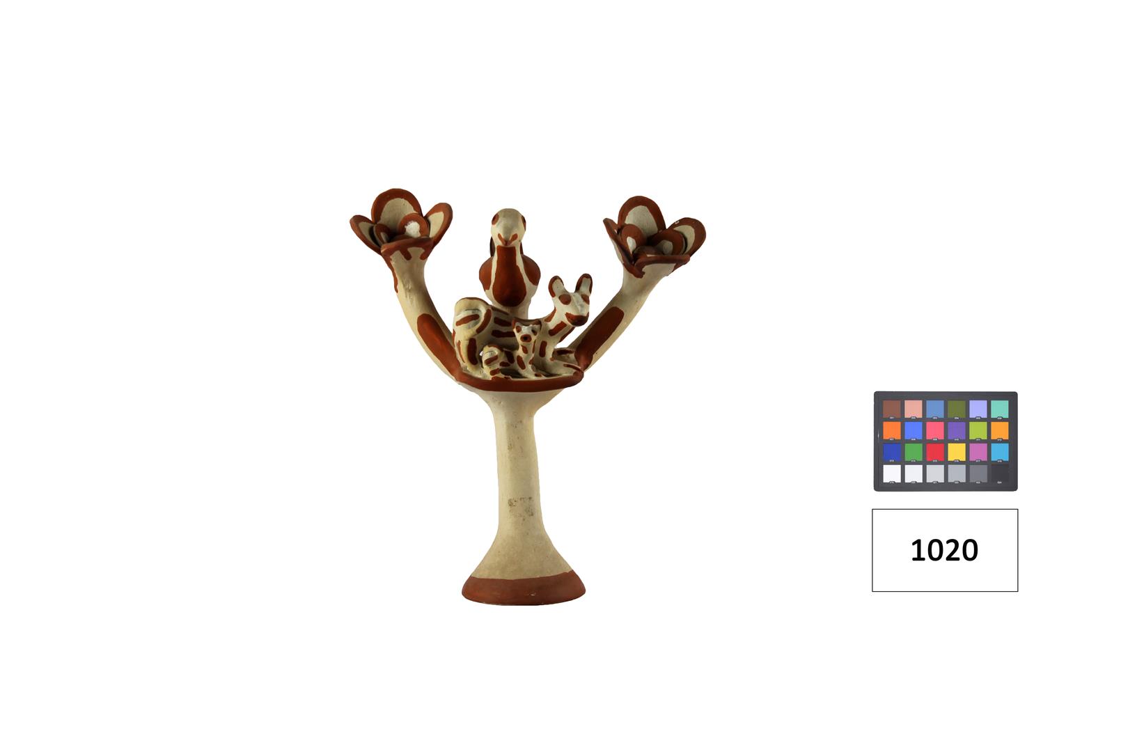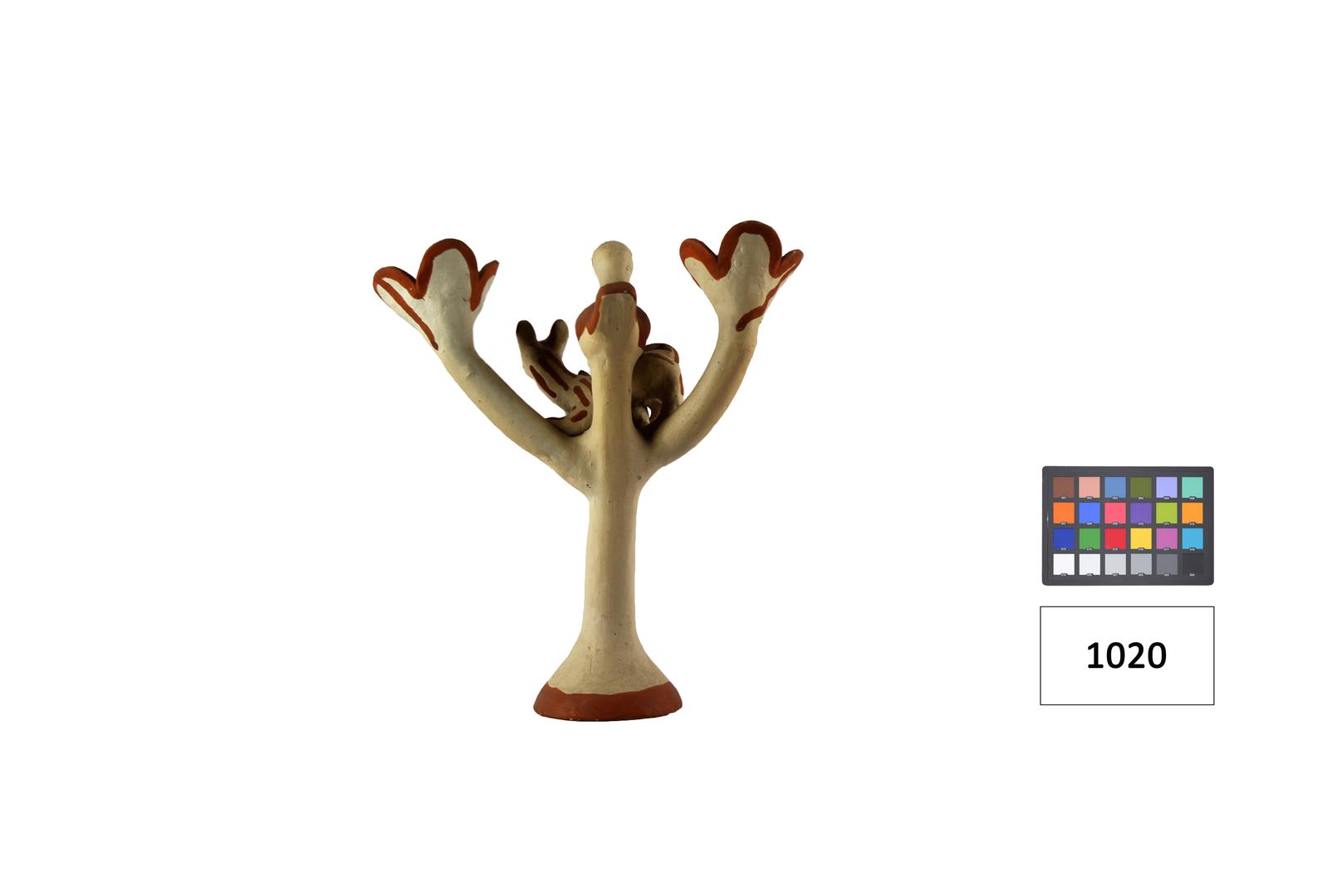 Objeto em formato árvore estilizada com dois galhos com uma flor e ao centro figuras zoomorfas sendo dois quadrúpedes encimado por uma ave, nas cores vermelho e branco.