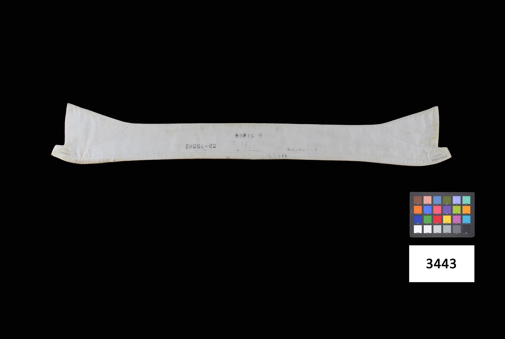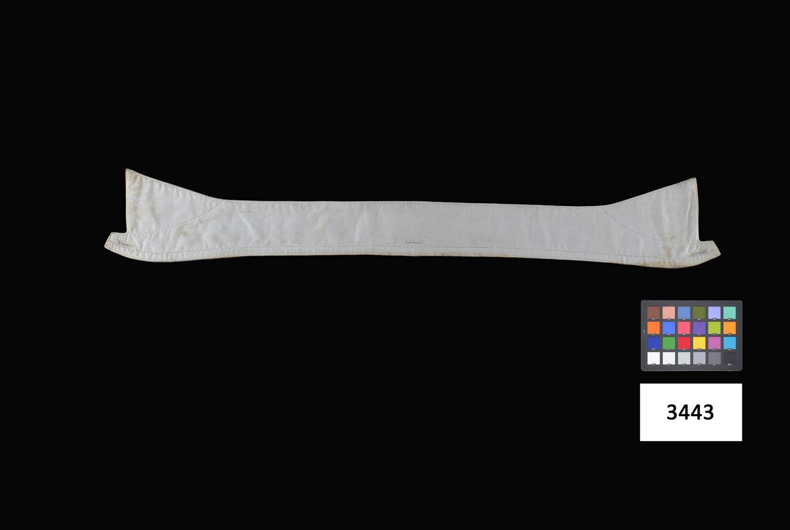 Lâmina de tecido oleado prensado com terminações superiores em bico, com abertura ao centro e extremidades, na cor branca.