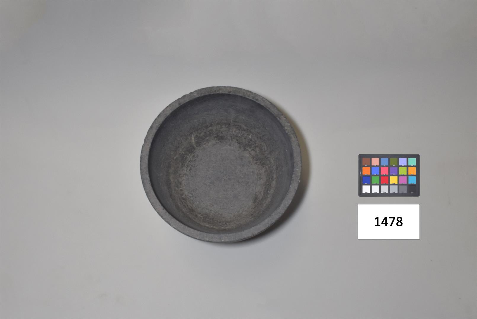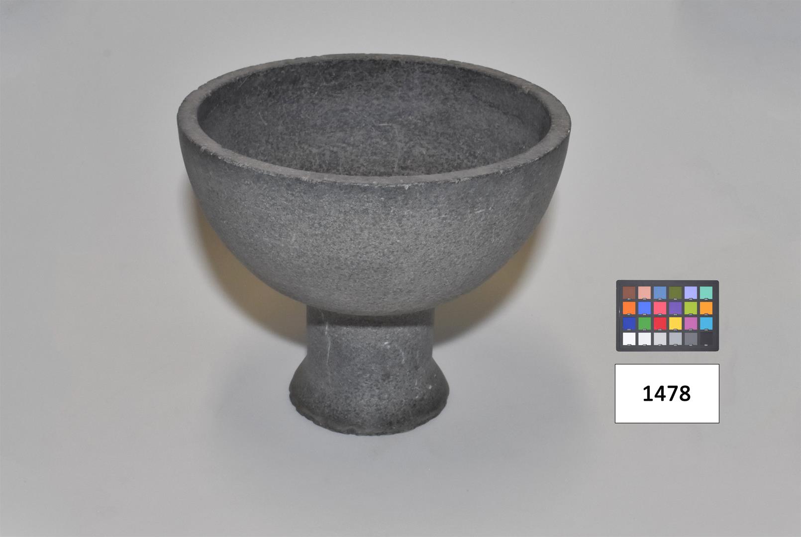 No formato de taça, em pedra acinzentada. Parte superior mais larga que a inferior. Pé com borda inferior mais larga.
