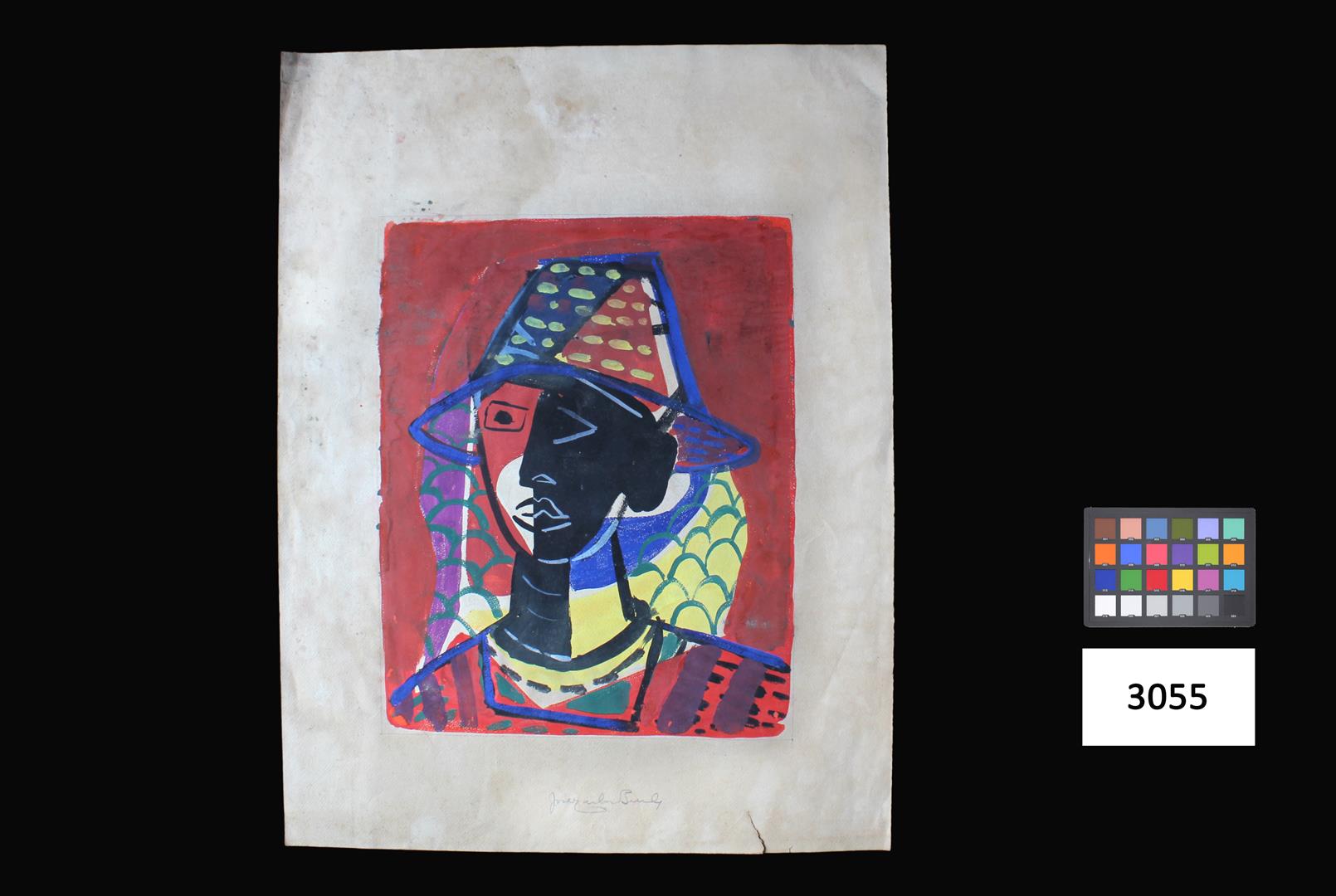 Composição nas cores vermelho, azul, amarelo verde. Em campo sobre fundo vermelho, busto de figura masculina de chapéu com aba nas cores vermelho, preto, branco, azul e verde; rosto dividido em vermelho, preto e branco, pescoço em preto, amarelo e azul, camisa em vermelho com detalhes azuis.