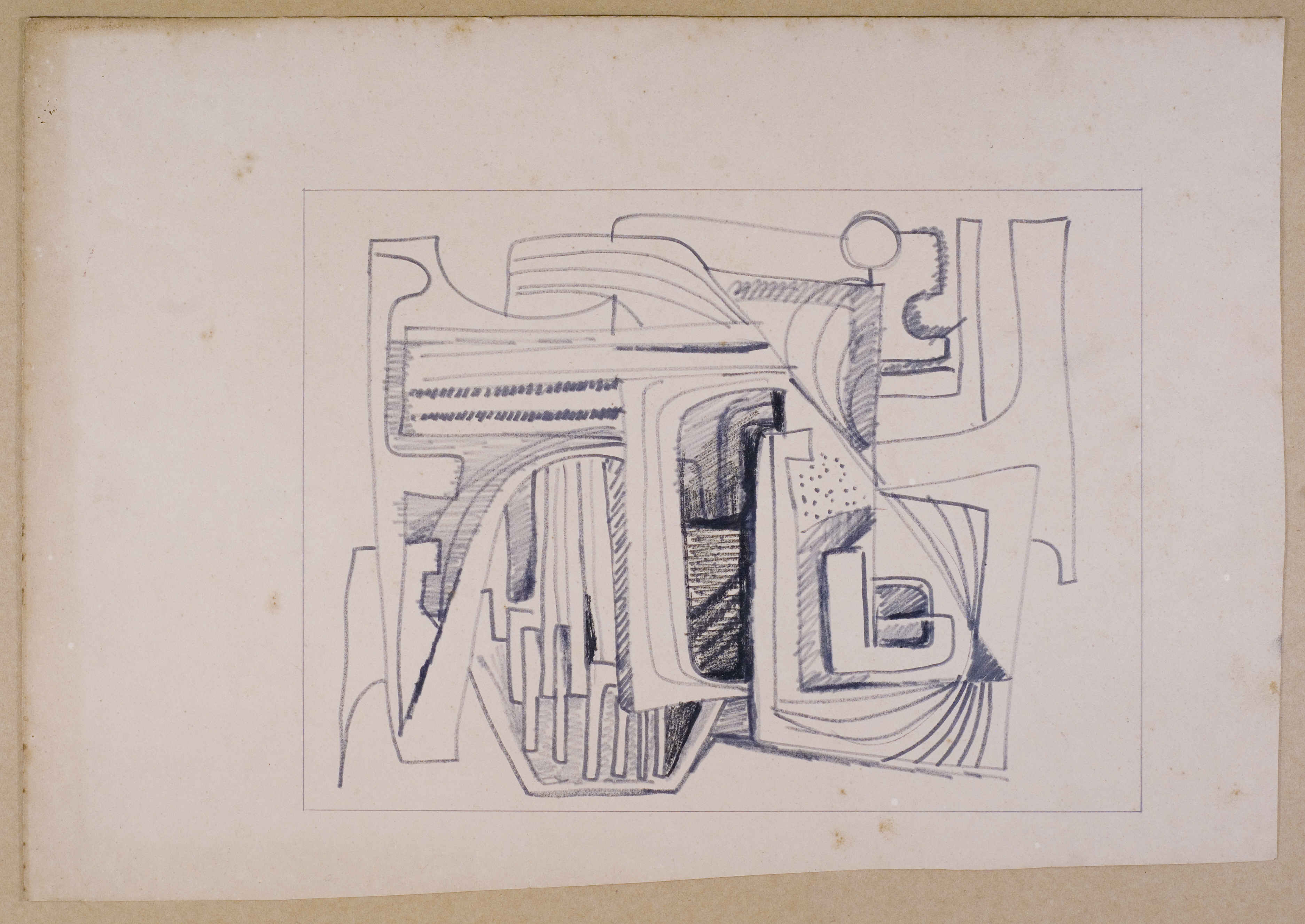 Desenho em tom de preto delimitado por retângulo reto. Composição abstrata com linhas finas. Ao centro, áreas preenchidas com tom claro e pontos.