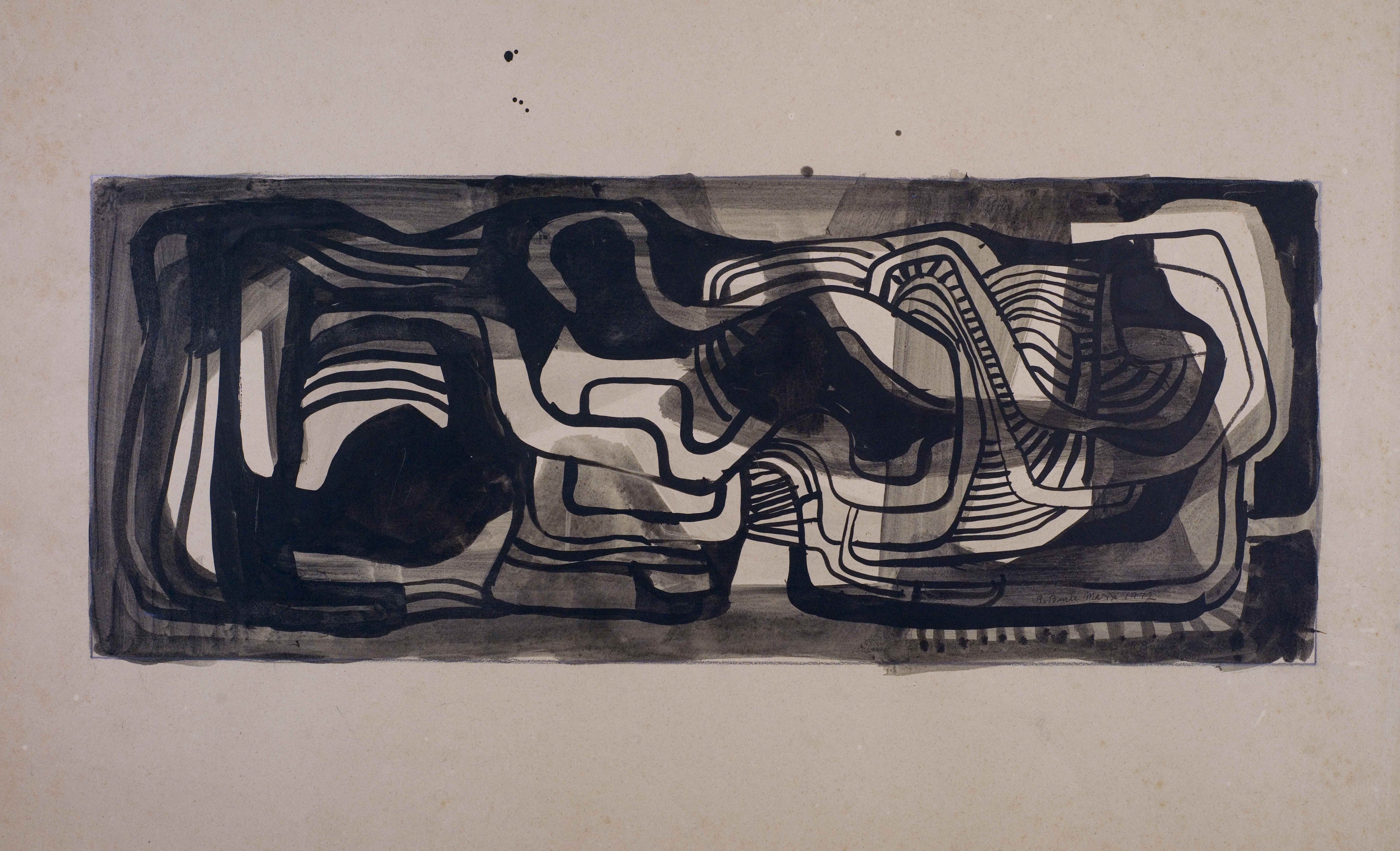 Pintura em tons de preto e cinza. Composição abstrata com fundo em tons variados de cinza com pinceladas uniformes. Sobreposto ao mesmo, linhas curvas e paralelas em preto fazem desenhos vazados por toda a superfície e uma grande área densa no canto inferior esquerda. Assinada e datada.