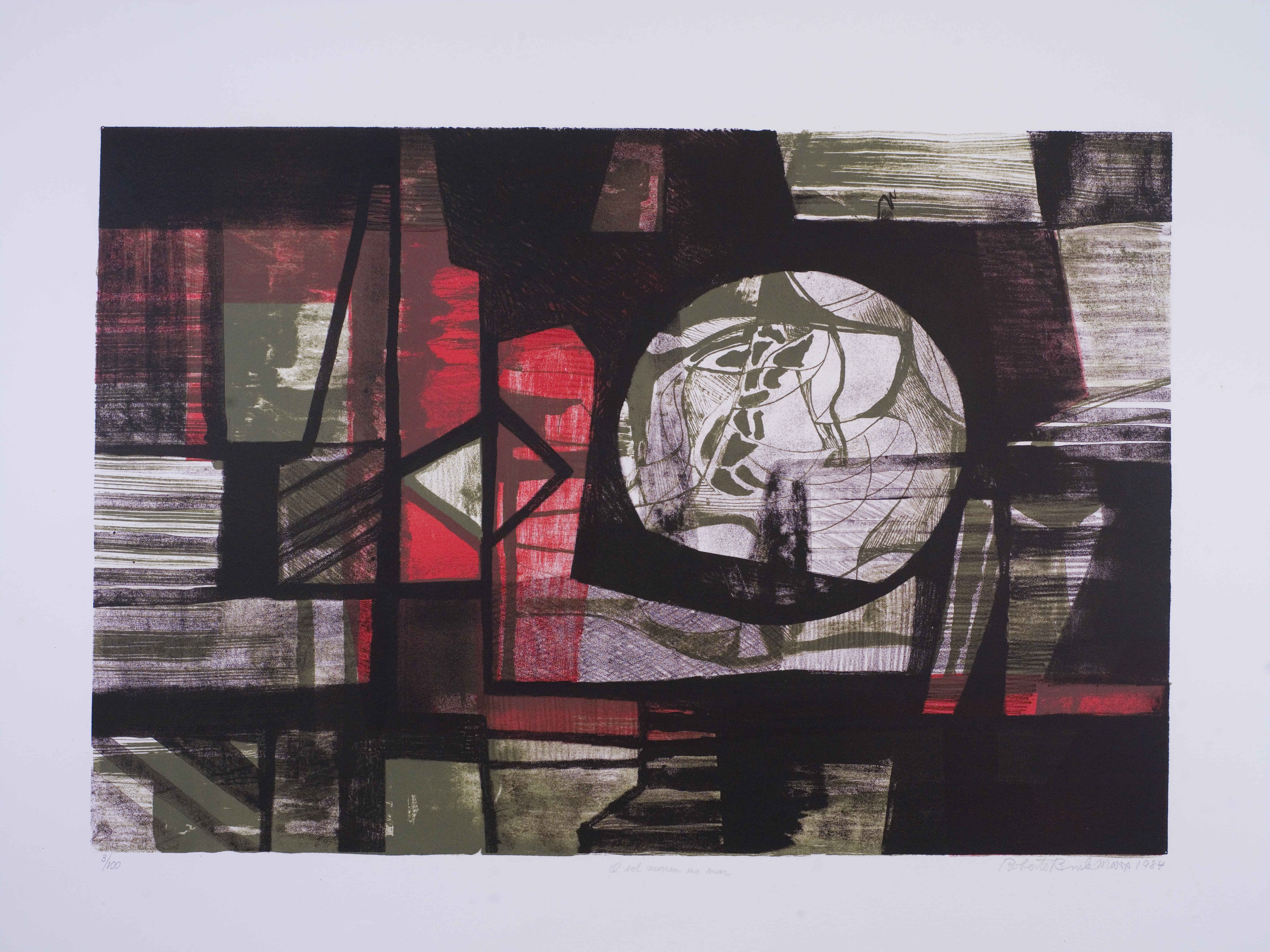 Composição abstrata com fundo em tom de preto e formas retas preenchidas em vermelho, branco e verde. Do centro para a lateral direita, grande círculo branco com linhas internas em verde fazendo desenhos. Assinada e datada.