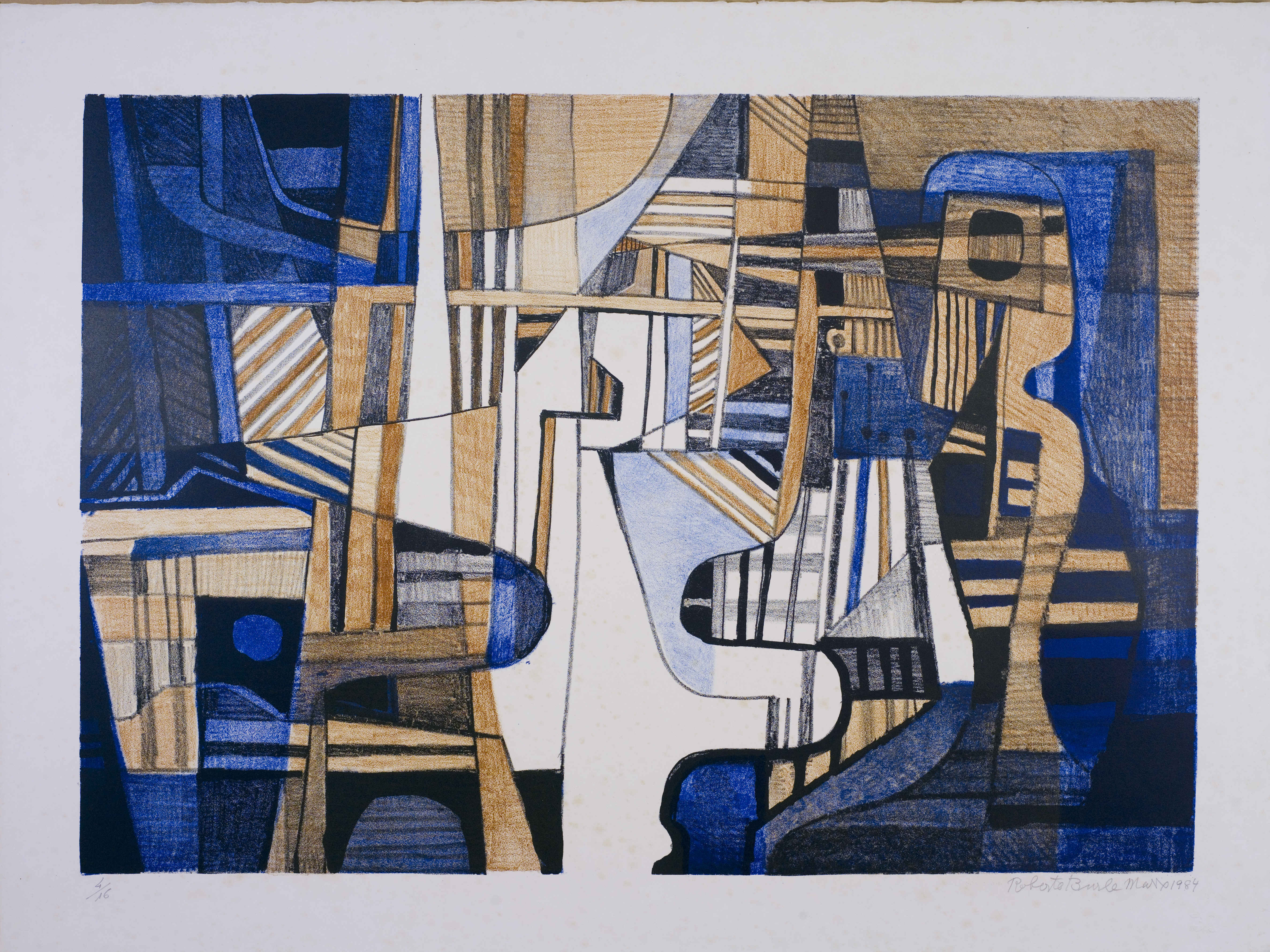 Composição abstrata com área vazada, sem preenchimento, se estreitando do centro da margem inferior até a lateral esquerda superior. Laterais compostas por linhas pretas que delimitam formas preenchidas em tons de azul e marrom. Assinada e datada.